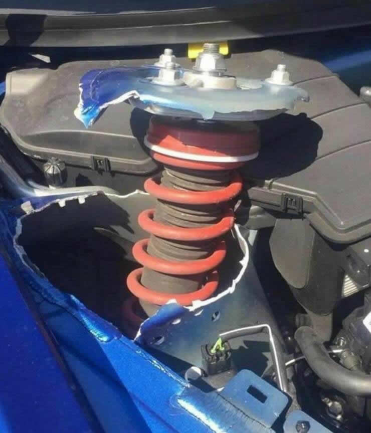 あとラリーではサスペンションの底付きでしばしばこういう風に突き抜けることがあるのでラリー車はあて板してがっつり補強するぞ。(レギュレーションで許されるカテゴリーに限る)
