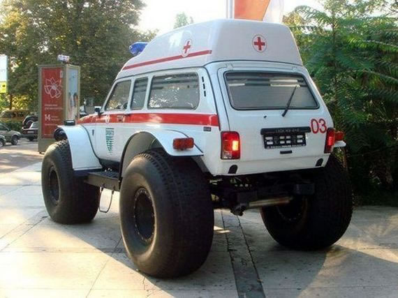 - むしろ激しい凸凹地形ならコイツのタイヤのエア圧落とした方が普通の救急車より乗り心地いいだろう